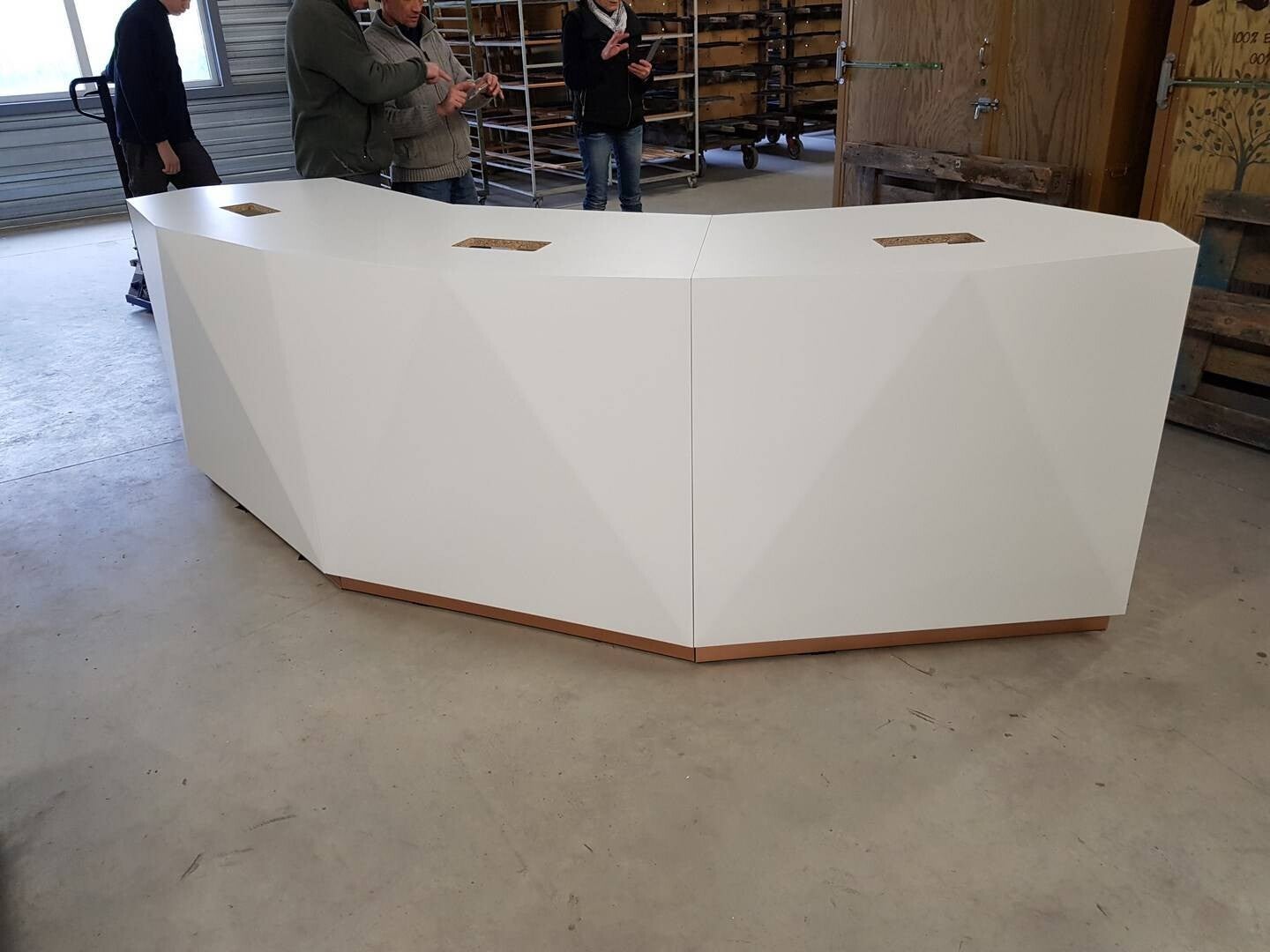 Chez Ébénisterie Berthomme, nous réalisons des prestations sur mesure pour répondre au mieux aux exigences de nos clients. Nous fabriquons et livrons nos produits, assurant ainsi un service complet et de qualité. Un exemple de notre savoir-faire : un mobilier en MDF laqué blanc très grand brillant pour une bijouterie.